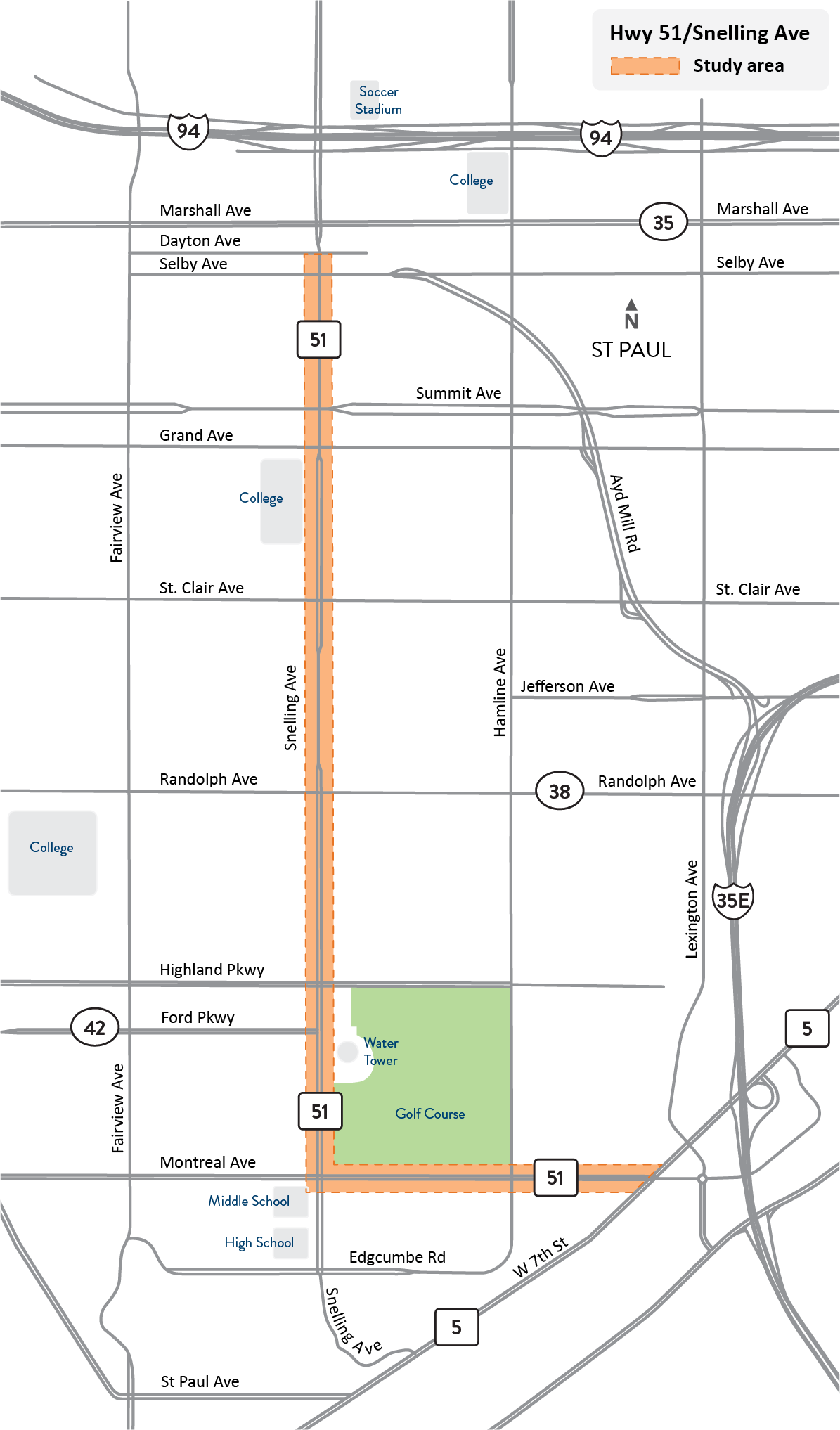 View full-size map We are studying Snelling Ave. and Montreal Ave. from Dayton Ave. to Hwy 5/West Seventh St. in St. Paul to understand what needs and opportunities exist in the area to help inform future projects along the road including a resurfacing project planned for 2030. We anticipate that improved safety and accessibility will emerge as key needs. The study will help to ensure that future projects include features that meet the needs of all users in the area, including pedestrians, bicyclists, transit users and drivers.Several portions of Snelling Ave. have undergone recent improvements, including between Grand Ave. and St. Clair Ave. which had a signal replacement at St. Clair Ave. and pedestrian improvements throughout in 2024. The segment between Ford Pkwy. and Montreal Ave. was also improved in 2024 with a four-to-three lane conversion, pedestrian refuge islands and a signal replacement at Montreal Ave. and Snelling Ave.